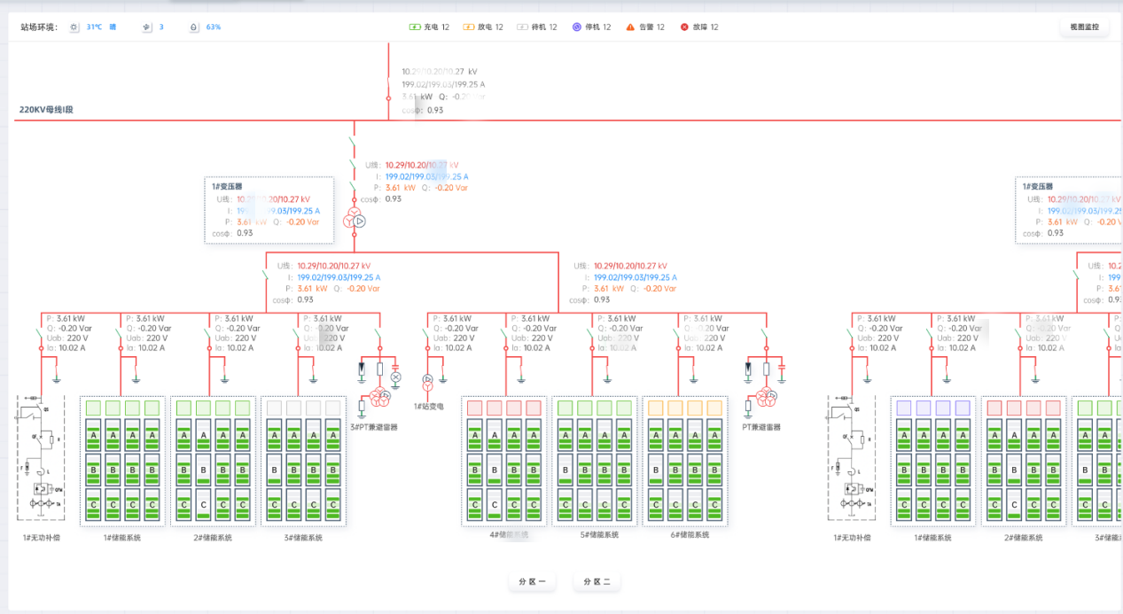 实时监控储能站关键设备包括PCS、BMS、冷却系统、消防系统等运行情况,通过3D渲染等数字孪生技术显示电芯电压、温度数据,并进行实时温差、压差等分析,确保电站运行安全。